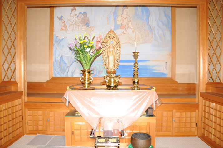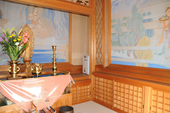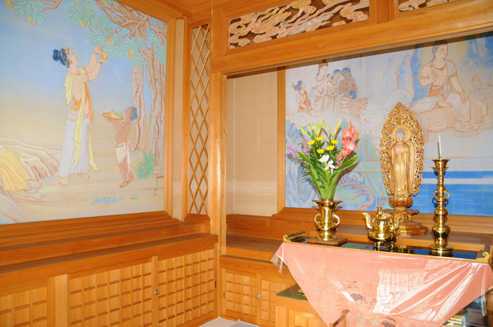 また、経堂(現在の納骨堂)には、一切経とともに壁画があり、左壁には「奄没羅採取図」、正面には観音の浄土を描いた「補陀落迦山図」が配され、訪れる人を魅了します。これらは昭和三十二年、檀紙町出身の画家・野生司香雪の筆によるもので、本堂にも同氏の襖絵八面「インド・ヒマラヤの雪山図」が残されています。